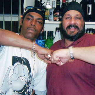 Alt text: two old photos from the 90s - a group of four young men in red and white American Football uniforms, with an older Black man in a sweater, jeans and cap, standing to their left. And from the 70s - a young Black man in a colourful kaftan.